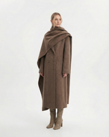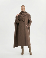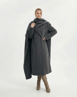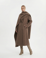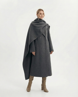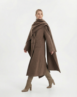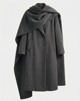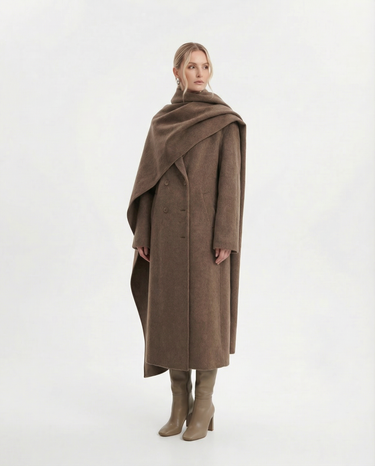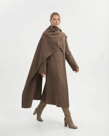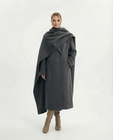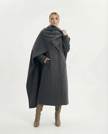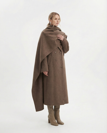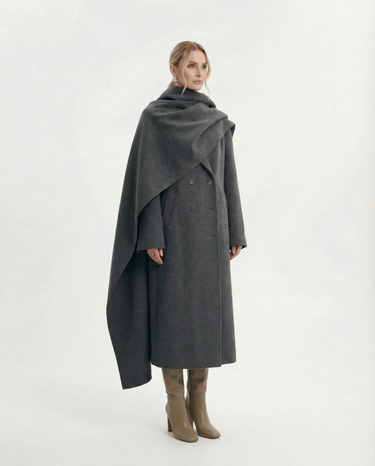 Design: Long woolen coat with a distinctive scarf-style collar, blending timeless tailoring with a cozy, elevated finish. Double-pocket accents and clean lines make it both practical and refined.