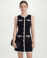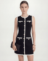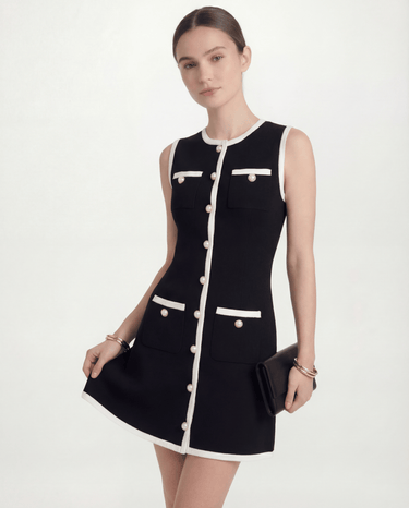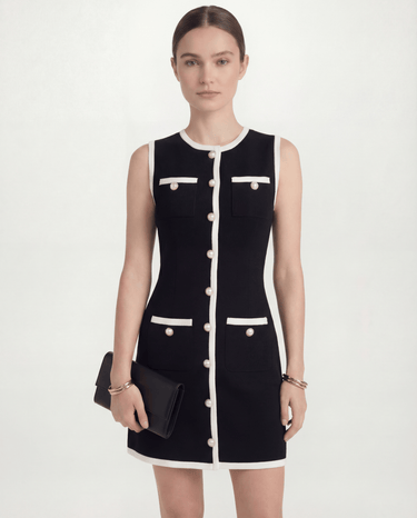 Design: A chic sleeveless contrast mini dress featuring simple button details for a modern, minimalistic look.