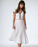 Fit: Slim fitting top and flowy pleated skirt work together to define the waistline and elongate the figure for a chic, balanced silhouette.