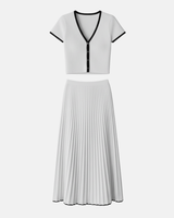 Design: Coordinated knit set featuring a slim V neck top paired with a pleated long skirt, creating a polished yet modern ensemble.