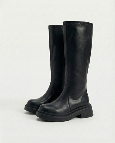 Design: Sleek riding boots with a streamlined silhouette and subtle hollowed detailing for a modern, elongating effect. The thick sole adds height while keeping the look refined.