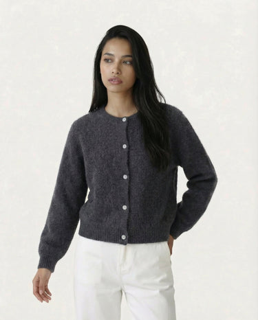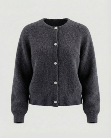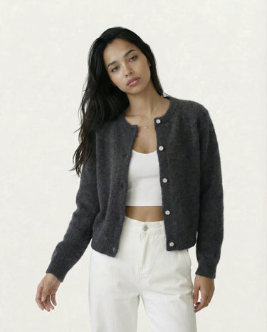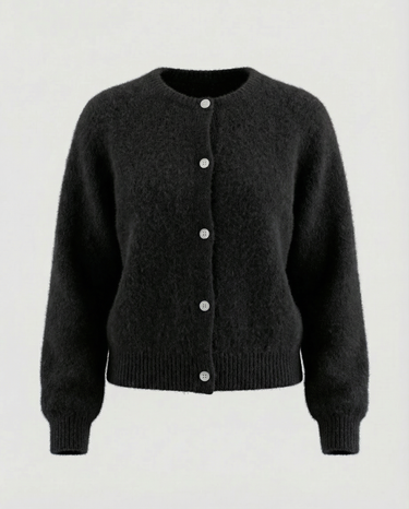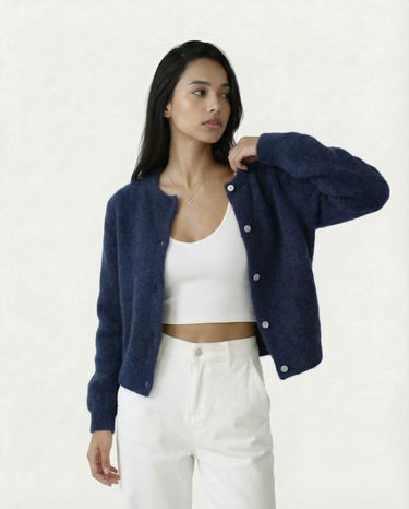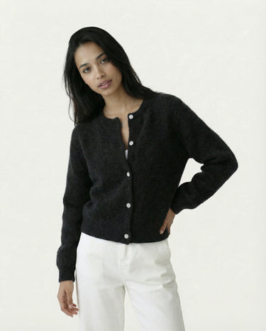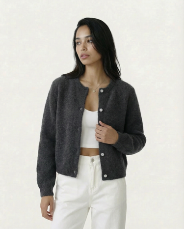 Design: A softly structured button front cardigan with a relaxed, slightly cropped fit and gently rounded neckline for an effortless, Parisian feel.