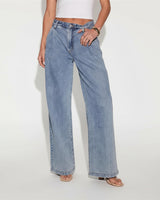 Design: Classic straight leg denim jeans in a refined blue wash, finished with subtle distressed detailing for an elegant yet casual look.