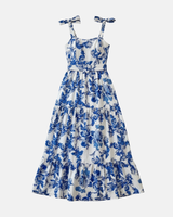 Design: Flowing blue and white floral maxi dress with a slightly curved neckline and adjustable tie straps, blending femininity with relaxed elegance.