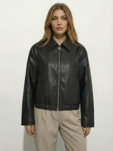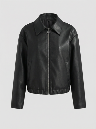 Design: A sleek faux leather lapel jacket with front zipper closure, crafted in a solid tone with a smooth finish for a modern, fashion forward edge.