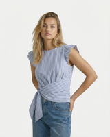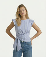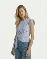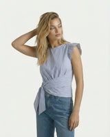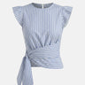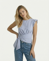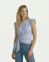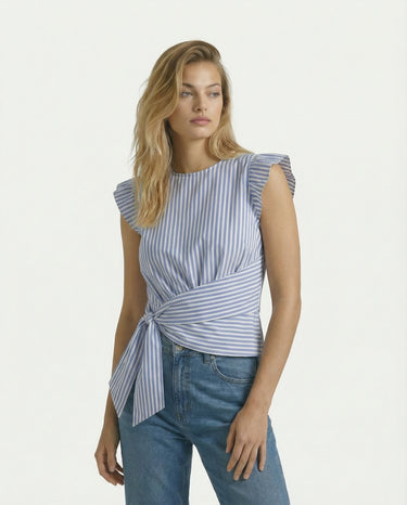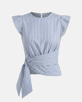 Design: A sleek, waist defining sleeveless top with classic horizontal stripes and a clean crew neckline for a polished, modern look.