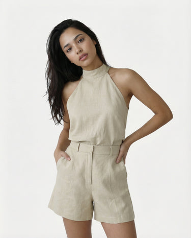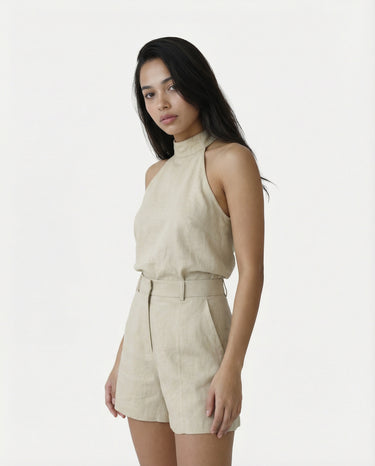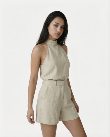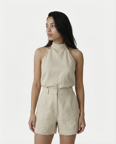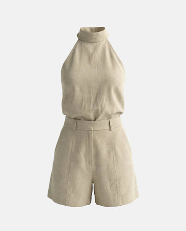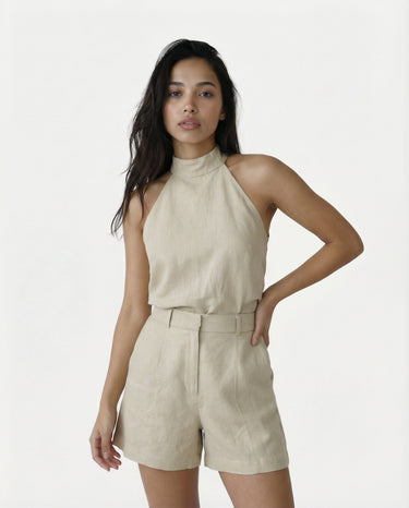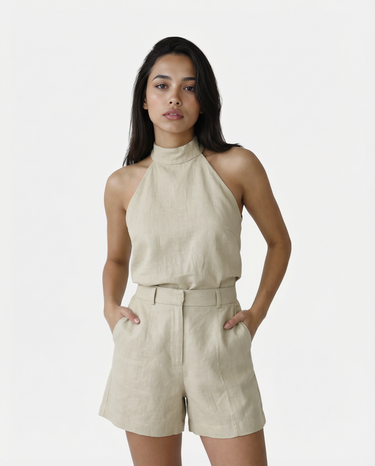 Design: A chic halter neck matching set in a soft khaki tone, combining effortless style with modern sophistication.