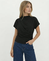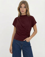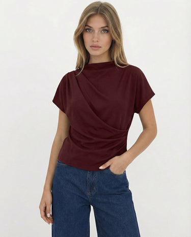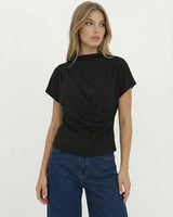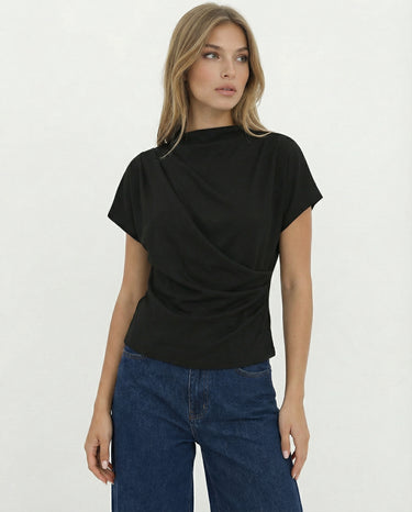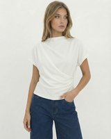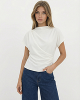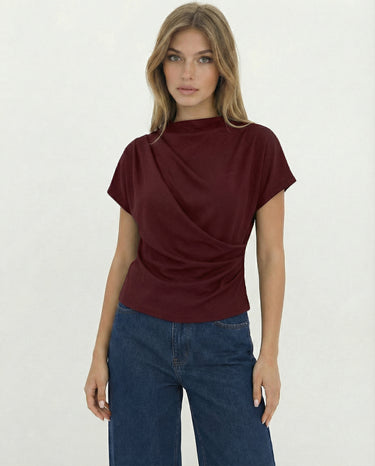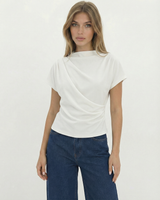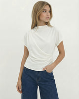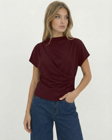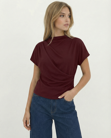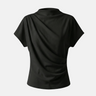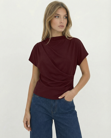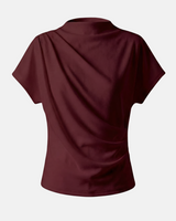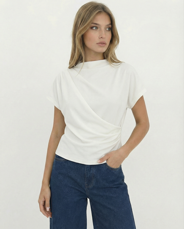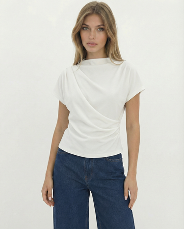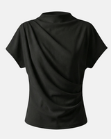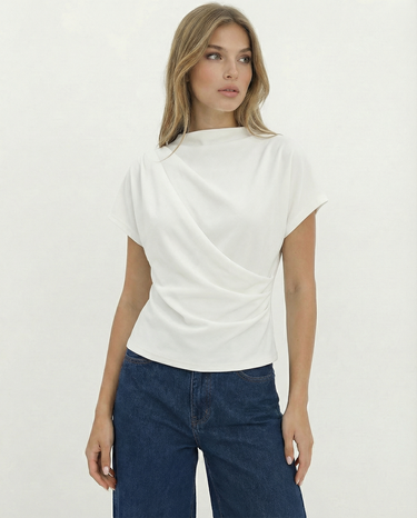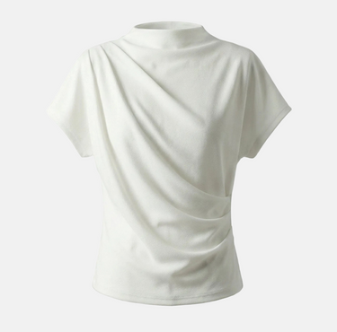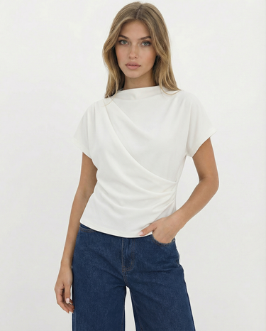 Design: A minimalist short sleeve top with a softly draped silhouette and clean round neckline. Designed to fall effortlessly on the body, offering an understated, refined look that feels modern and versatile.